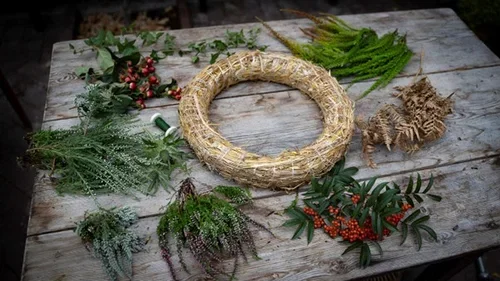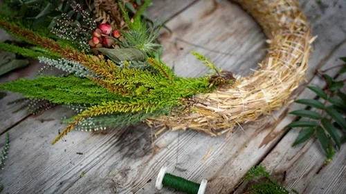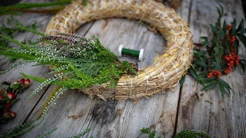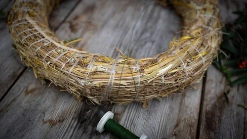 Tips! Når kransen har gjort sitt kan du ta av det du har surret fast på halmkransen. Bruk gjerne stammen om igjen neste gang du skal lage en krans.