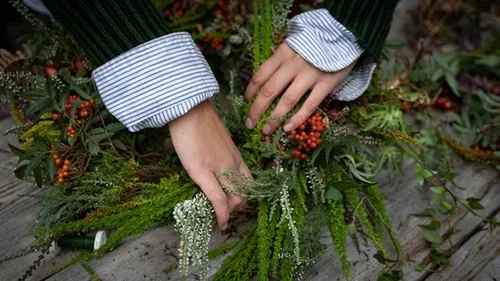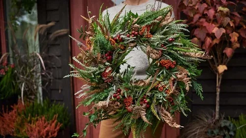 Velg hvilke planter du vil ha i kransen. Denne trinn-for-trinn-guiden viser hvordan vi laget kransen i naturlige høstfarger. Du kan følge samme fremgangsmåte for å lage den rosa kransen – eller en krans med dine egne favorittplanter.