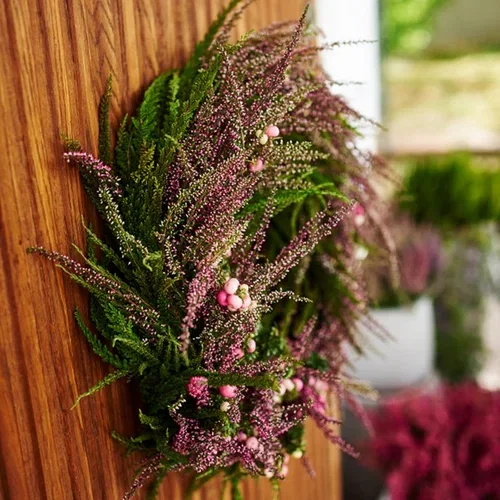 Denne rosa drømmen av en høstkrans kan du enkelt lage selv ved å plassere rosa Calluna ‘Garden Girls’ i midten og grønn Calluna ‘Skyline’ mot ut- og innsiden av kransen. Ved å bruke bærmyrt som pynt setter du prikken over i-en. Bare tre bærmyrt inn i kransen etter at den er bundet ferdig.