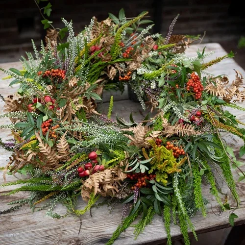 I denne kransen får de naturlige høstfargene skinne. Vi har valgt grønn Calluna ‘Skyline‘ lyng, hvit og rosa Calluna ‘Garden Girls’ lyng, rød hyperikum og strutseving. Som ekstra pynt har vi valgt rognebær. Plantene er i litt ulike farger og teksturer, som til sammen får fram høstfølelsen på en fin måte.