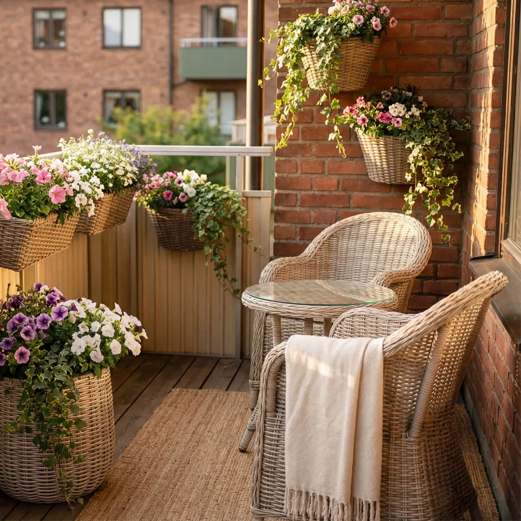 En balkongkasse som gir et lett og levende uttrykk. Plant petunia eller lobelia for en fargerik blomsterprakt.