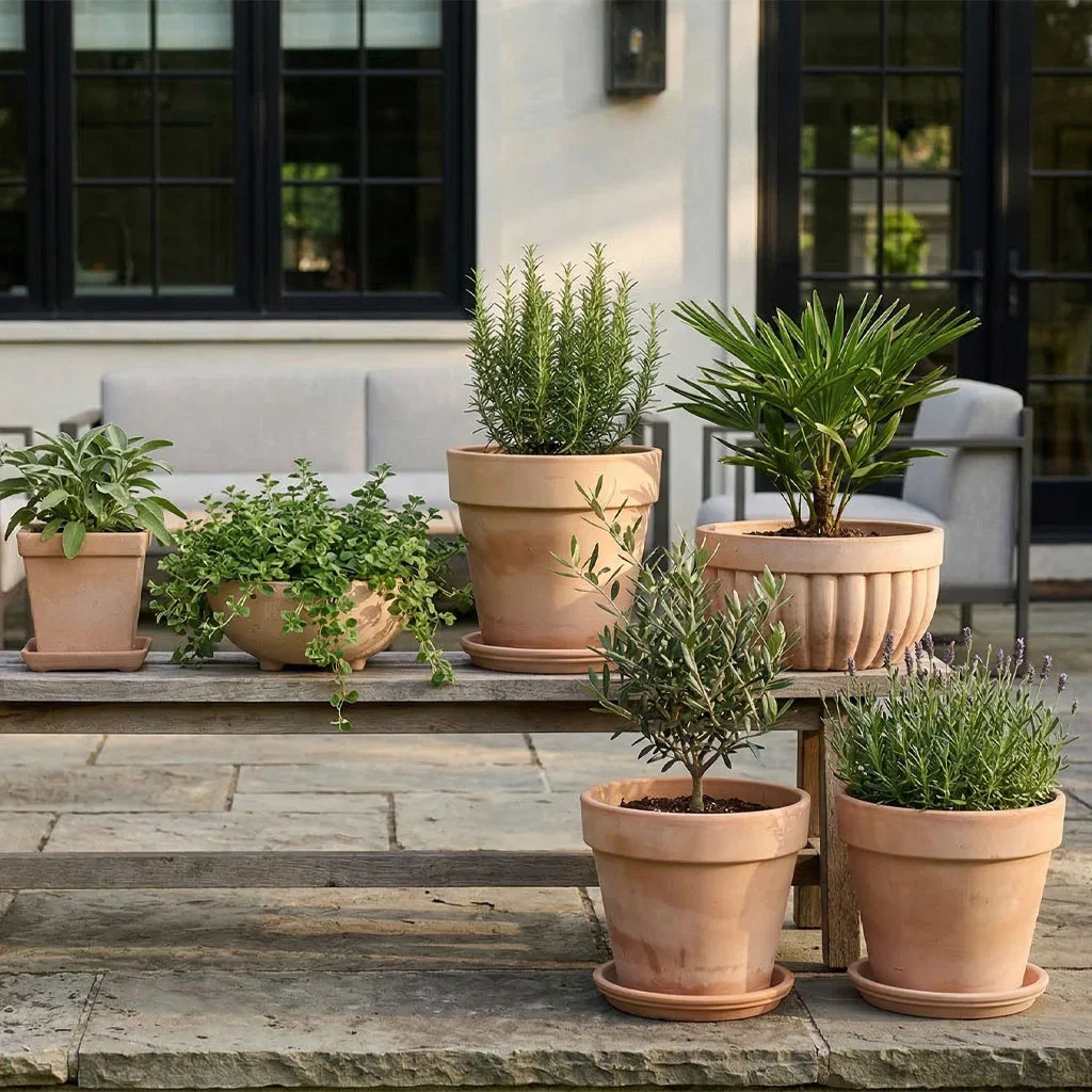 Terrakotta hører hjemme i en middelhavsinspirert stil, der solvarme materialer, frodige planter og tidløse former skaper en avslappet atmosfære. Samle terrakottapotter i ulike størrelser i grupper for et levende og personlig uttrykk – som på en sjarmerende gårdsplass i Sør-Europa.