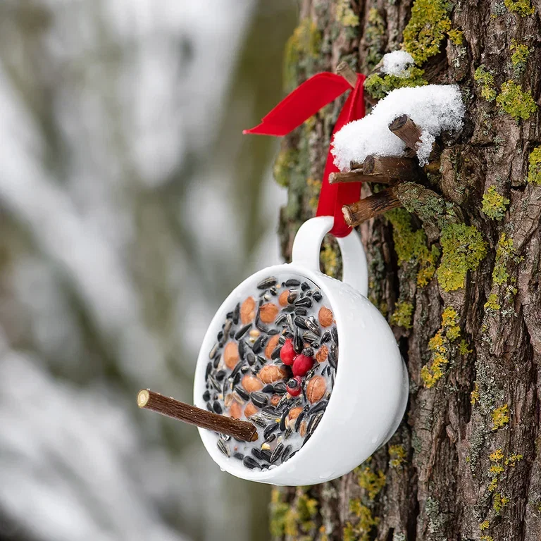 TIPS! Har du en kopp du ikke er så redd for? Fyll blandingen i den, og heng hele koppen ut i treet. Hvis du lar en kvist eller skje stå i koppen mens blandingen stivner, får fuglen noe å sitte på mens den spiser også.