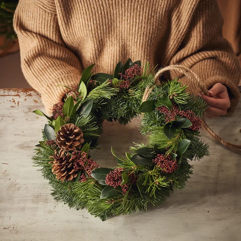 TIPS! For å få en jevn krans er det lurt å feste bukettene i et mønster. Du kan for eksempel feste annenhver bukett av furu og gran, eller la hver tredje bukett inneholde skimmia. Prøv deg frem for å se hva som blir fint – det er bare fantasien som setter grenser!
