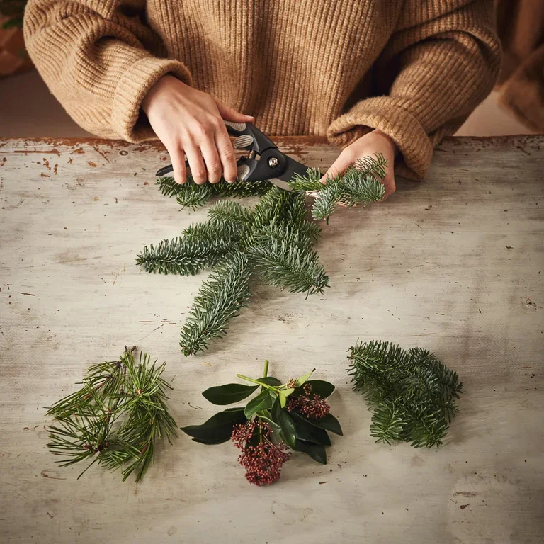 Velg hvilke vintergrønne nåletrær og planter du vil ha i kransen. Vi gikk for gran, furu og skimmia. Bladene på skimmia har en annen form og blomstene har litt farge, noe som gir et fint spill i kransen.