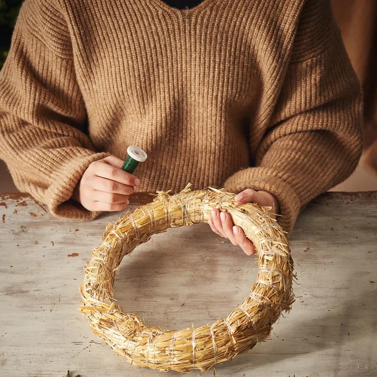 TIPS! Når kransen har gjort sitt kan du ta av det du har surret fast på halmkransen. Bruk gjerne stammen om igjen neste gang du skal lage en krans.