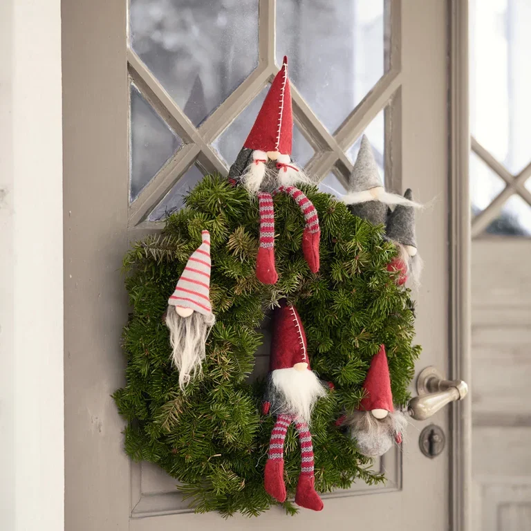 Hvis du ikke har lyst til å lage en krans fra bunnen, finner du ferdige kranser hos oss med granbar som du kan dekorere selv. Søte nisser kan også få plass på kransen.