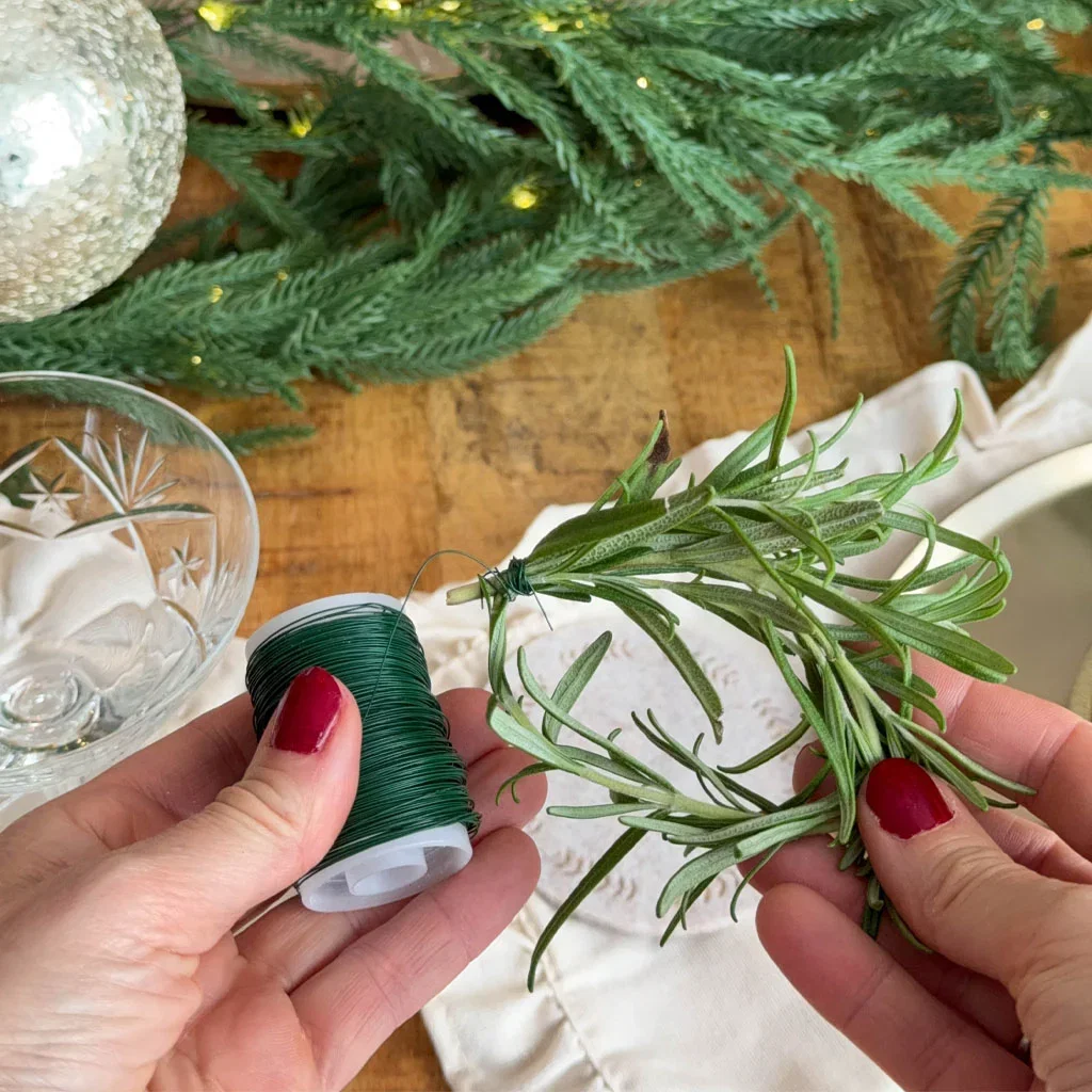 2. Klipp av en stilk rosmarin og form den som en liten sirkel – omtrent på størrelse med glassbrikken. Knytt den sammen med den grønne tråden.