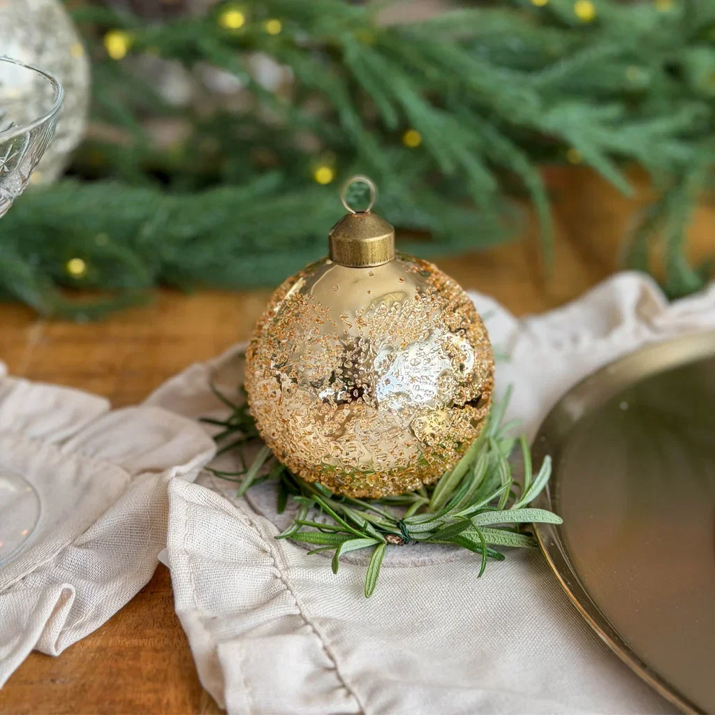 3. Legg rosmarinsirkelen på glassbrikken og plasser en julekule i midten. Lim fast elementene, eller la dem ligge løst.