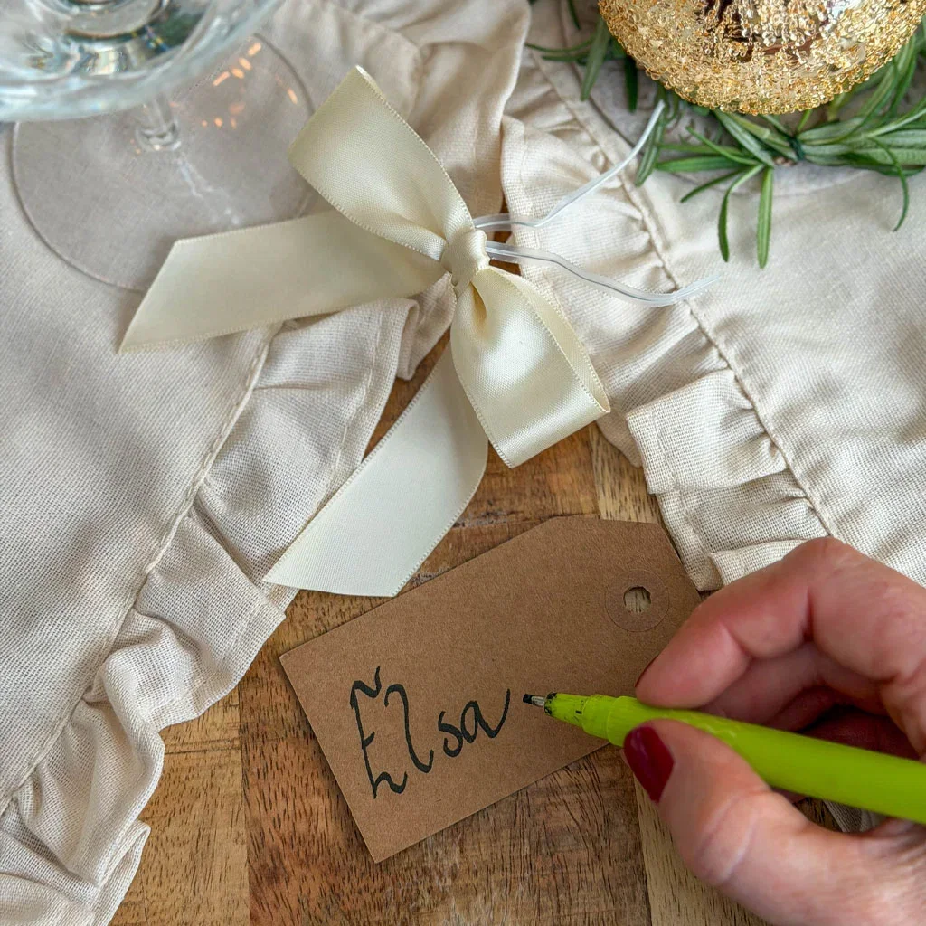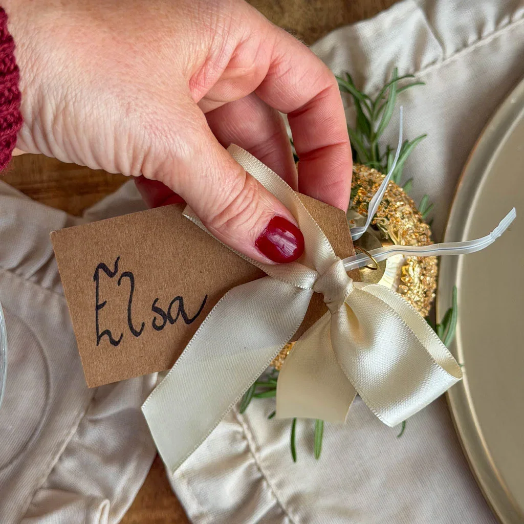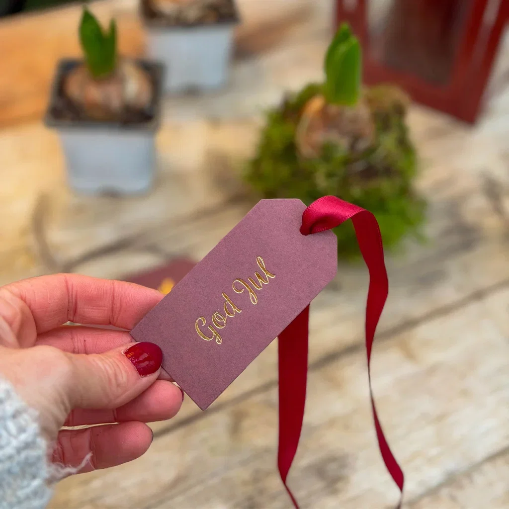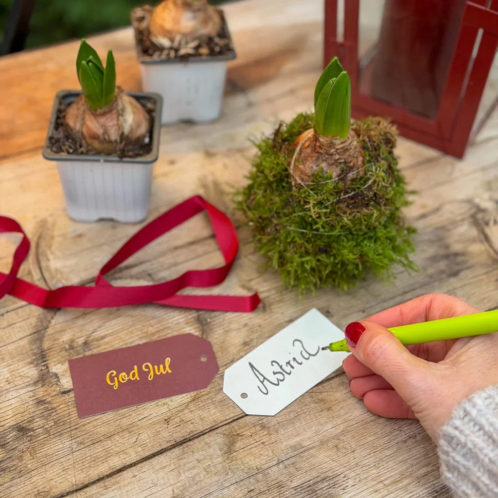 6. Fest navnelappen rundt stilken på løken og knyt en pen sløyfe.