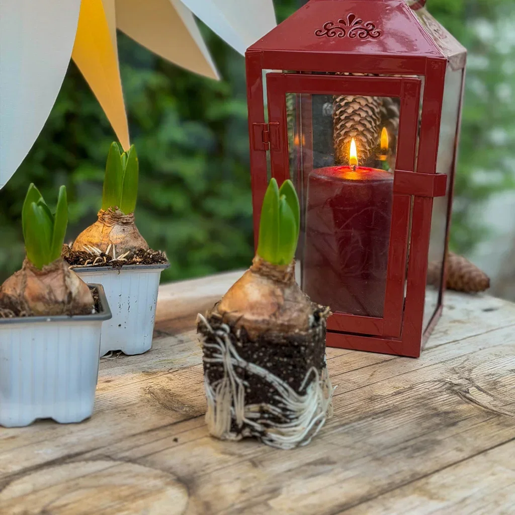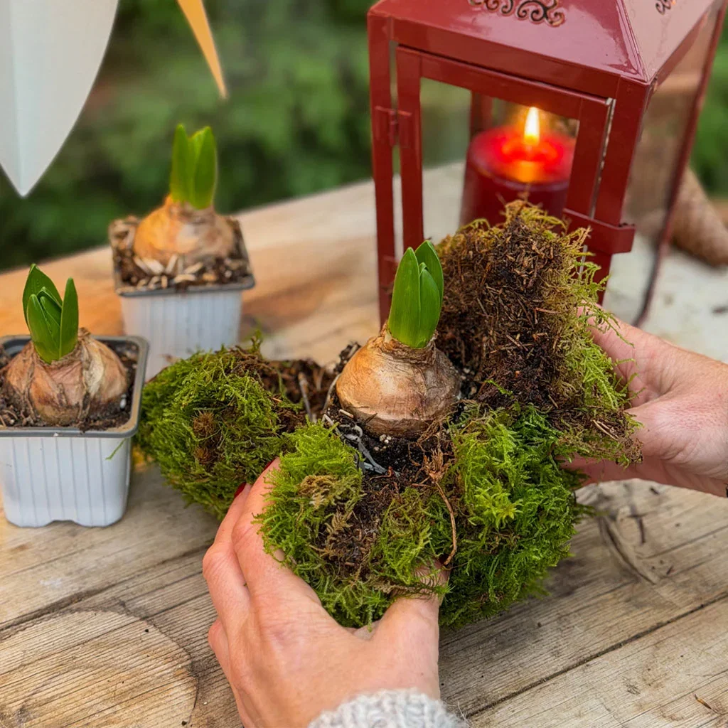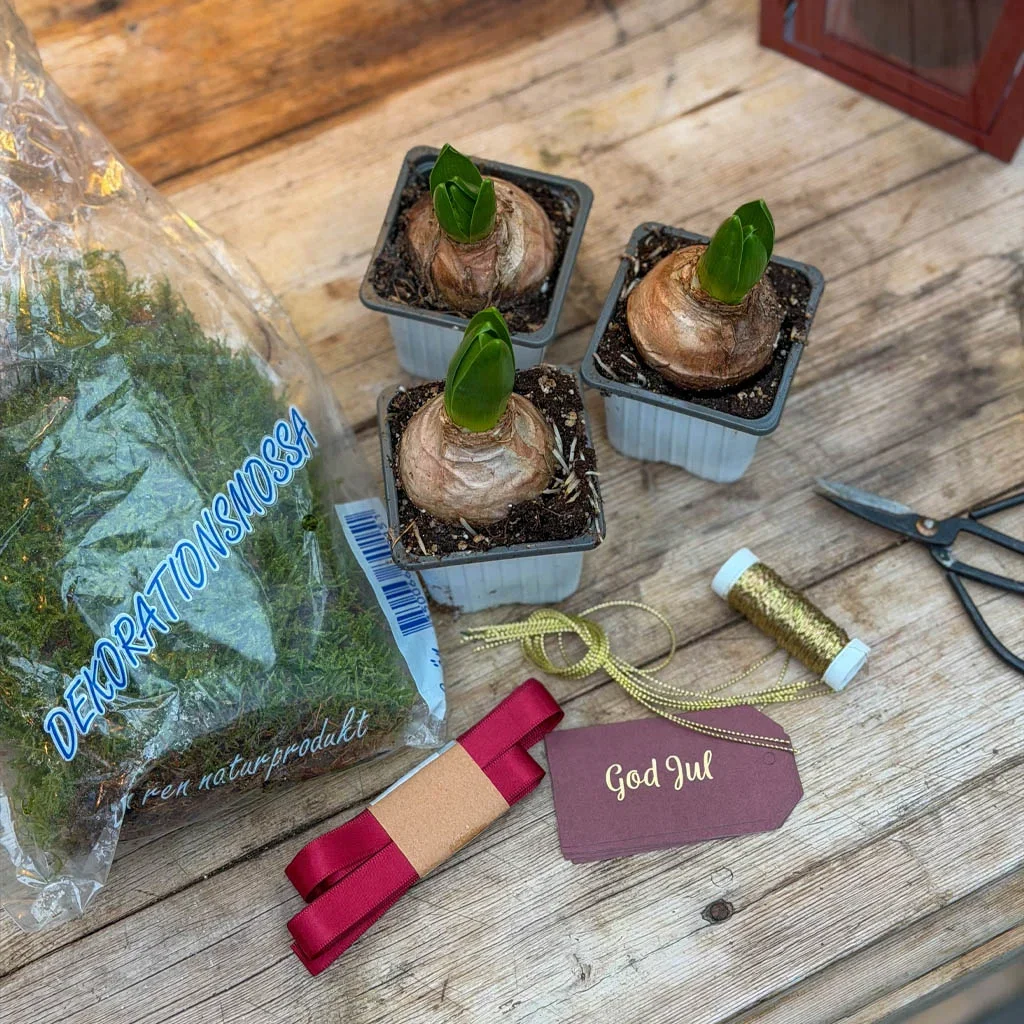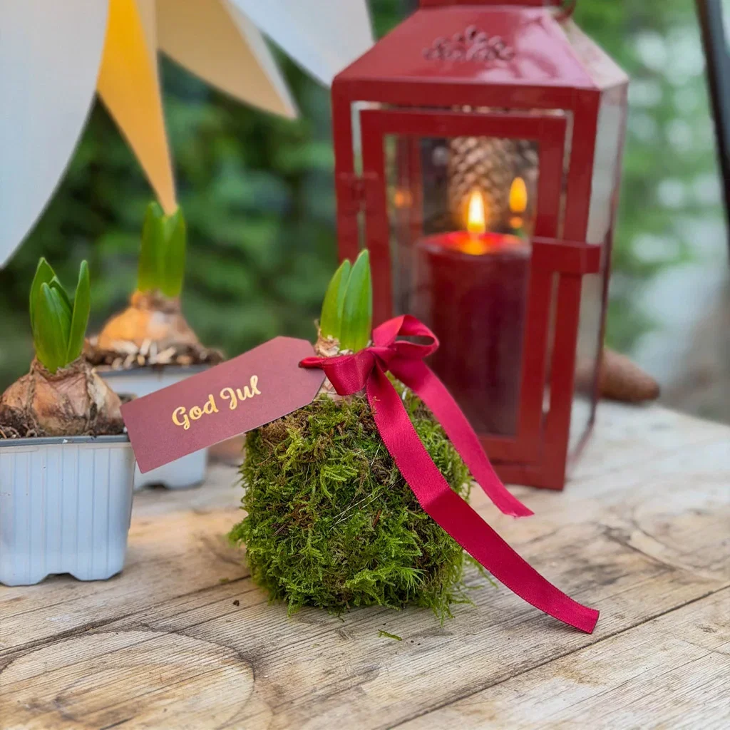 Rødt, grønt og gull – her får du klassisk julefølelse med en personlig touch. Også denne varianten inneholder levende planter, men gir en mer lun og nostalgisk følelse.