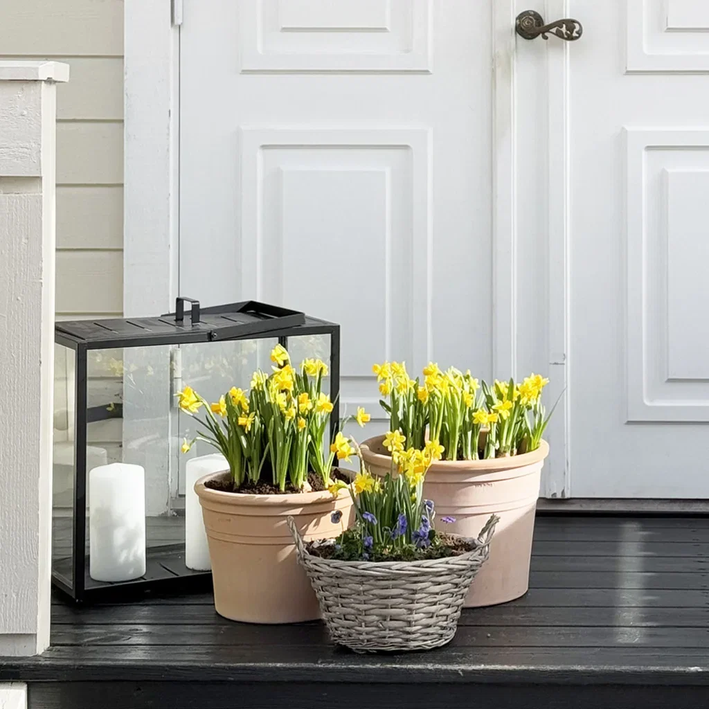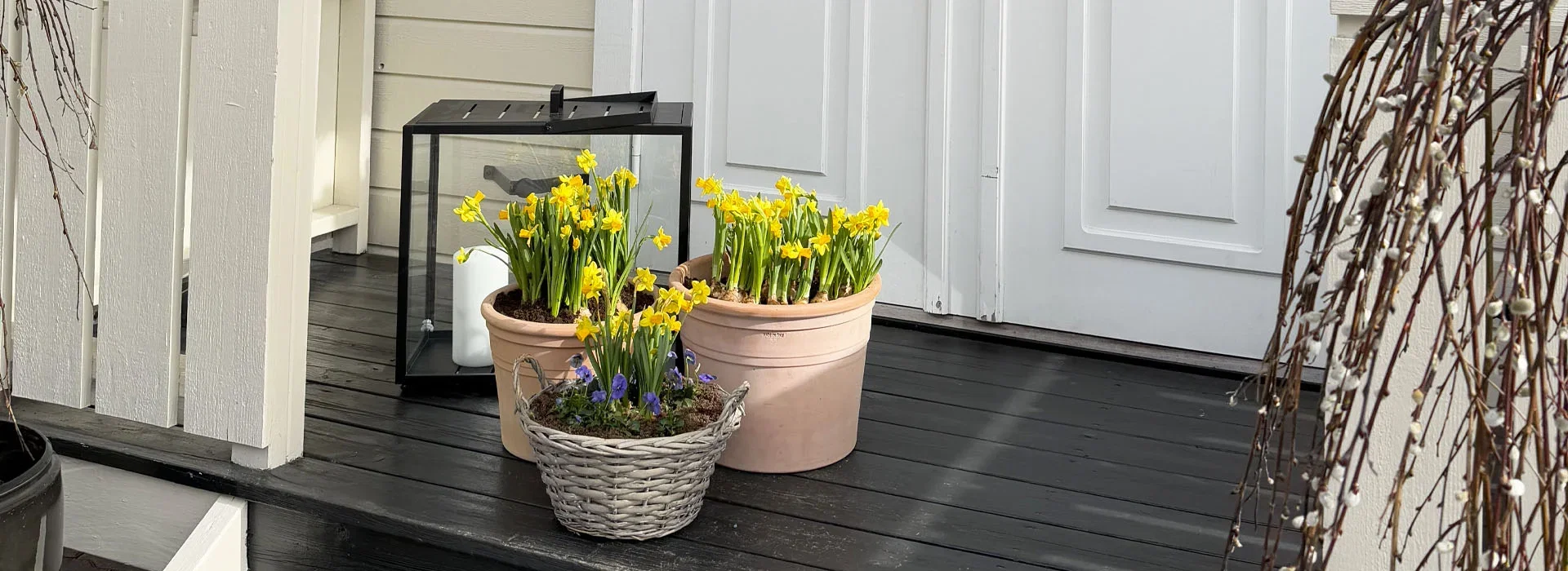Her har vi valgt to terrakottapotter i ulike høyder, begge fylt med påskeliljer for et bugnende uttrykk. En bred kurvpotte med flere liljer og stemor gir variasjon og farge. Dette passer perfekt for deg som ønsker et frodig inngangsparti med en naturlig miks av vårens favoritter.