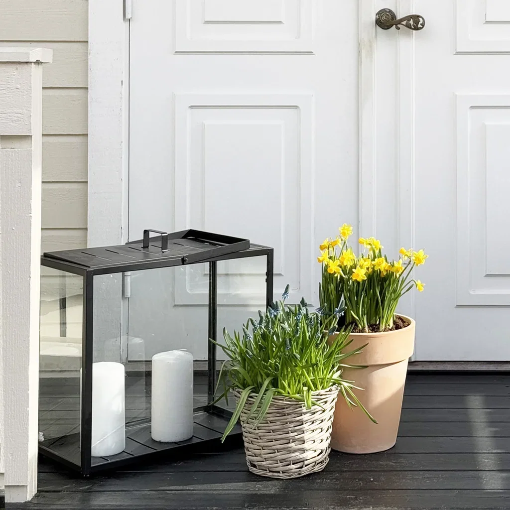 Med Caroline-lykten (finnes i flere størrelser), en stilren terrakottapotte med minipåskeliljer og en kurvpotte med perleblomster – mer klassisk vår enn dette blir det nesten ikke. Perfekt for deg som ønsker et rent og naturlig uttrykk.