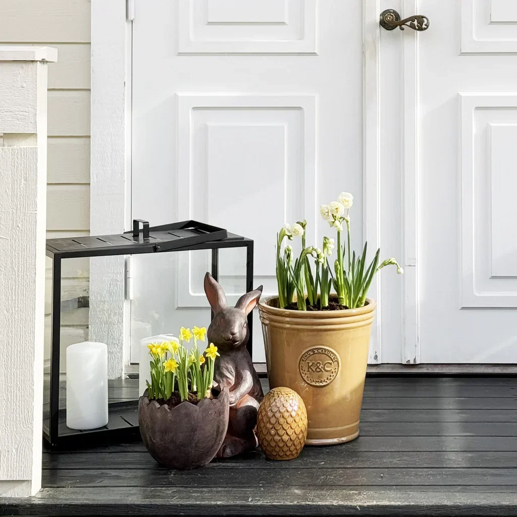 Påske med stor P! Velg gule potter (de er perfekte nå) og fyll dem med hvite påskeliljer for en frisk kontrast. Legg til keramiske egg, noen søte påskeharer og kanskje en dørkrans med fjær og kvister. Jo mer personlig, jo bedre!
