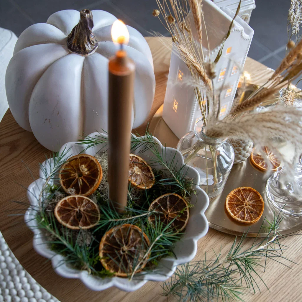 For å bevare høstfølelsen samtidig som du forbereder for vinteren, kan du dekorere med naturmaterialer som grener, kongler og tørkede appelsinskiver. En enkel bukett med eukalyptus eller granbar kan også gi en forsmak på advent, uten å føles for julete. Høstkranser og tørkede blomster er også flotte innslag.
