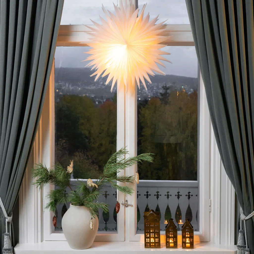 Adventsstjerner i vinduene er også koselige, spesielt i naturlige materialer som papir eller tre, og i nøytrale farger. De gir et subtilt lys og en antydning om den kommende høytiden.