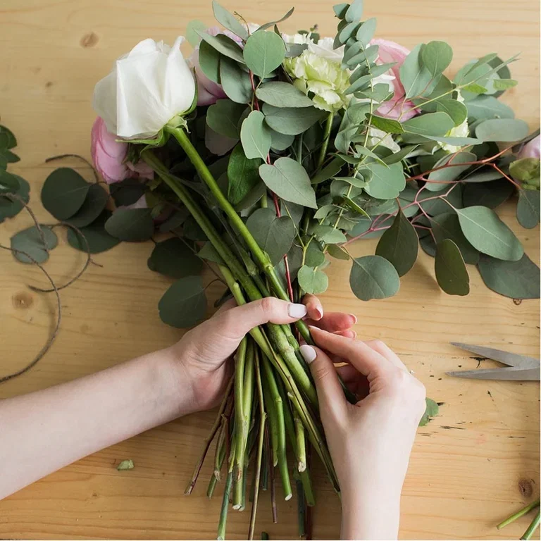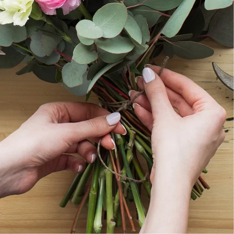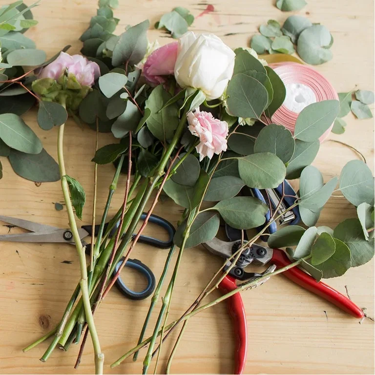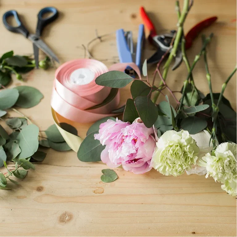 - Hyssing, bånd eller blomstertråd til å binde buketten