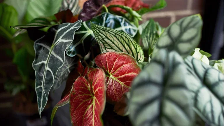 Alocasia er en annen tropisk favoritt. Den har ikke bare fargerike blader, selv stilkene kan være lyserose på enkelte sorter.