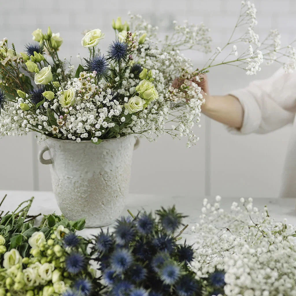 Sett buketten i en vase som er omlag en tredel så høy som buketten eller i flere vaser i forskjellige størrelser. Det er også fint å sette noen enkelte blomster i små vaser i en gruppe. Noen ganger kan vasen virke for bred for blomstene og resultatet er at de står og henger mot kanten. Da kan du lage et rutenett med teip over vasekanten og stikke blomster jevnt fordelt i rutene. På denne måten står de oppreist og fyller vasen bedre.