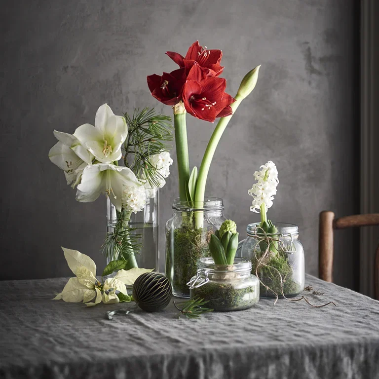 Lag en vakker bukett med amaryllis! Sett dem i en vase i stedet for i en potte og umiddelbart har du en litt mer moderne stil på julen hjemme.