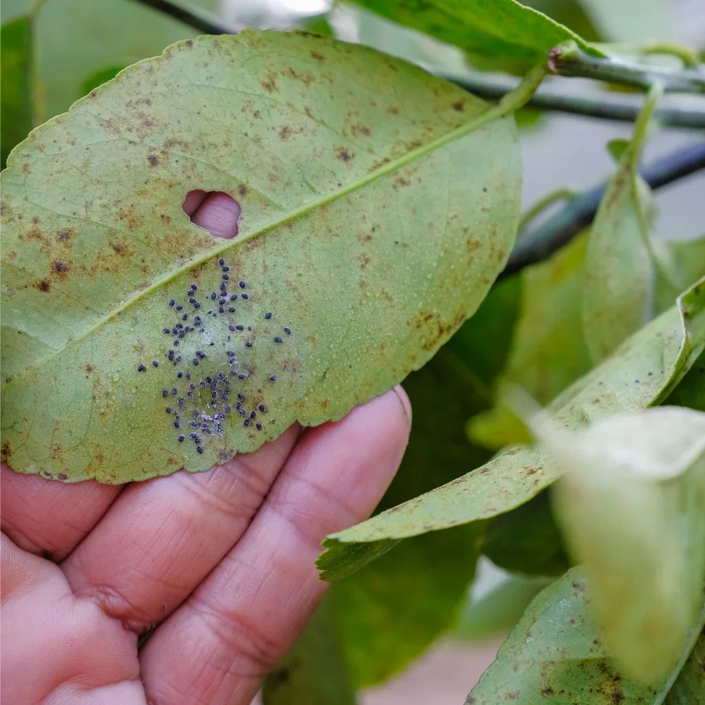 Tripsens ekskrementer på undersiden av et blad er et tydelig tegn på at planten er angrepet av den plagsomme gjesten.