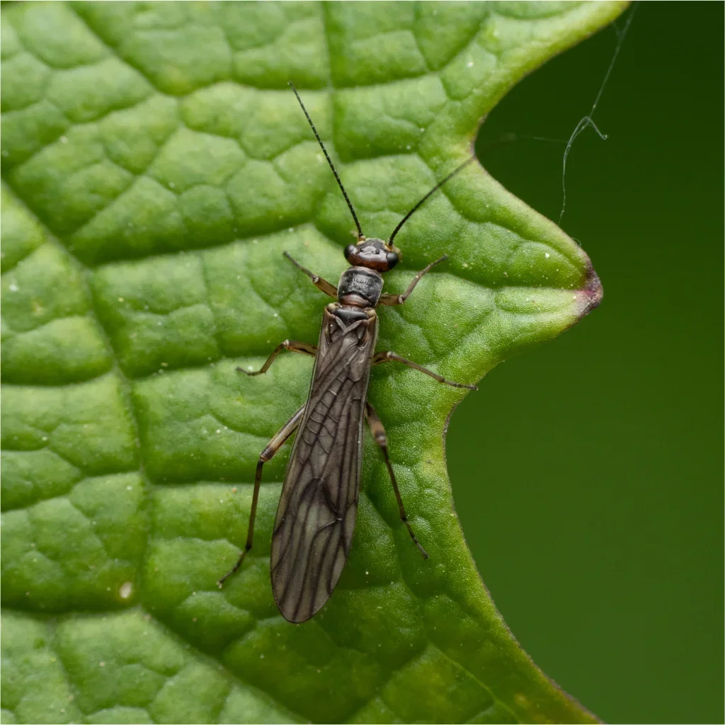 En voksen trips, klar til å legge egg. Voksne individer er ofte mørkere og flyr når de forstyrres, noe som bidrar til rask spredning mellom plantene.