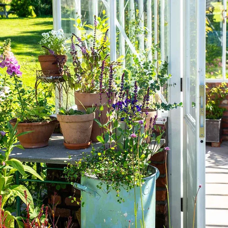 Rustikke terracottapotter med stauder i pynter opp et gammel symaskinbord utenfor drivhuset. Personlig og sjarmerende.
