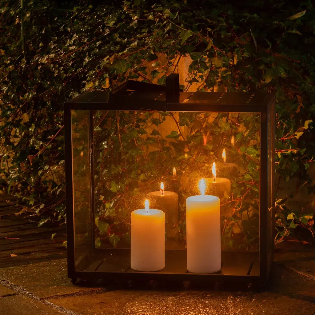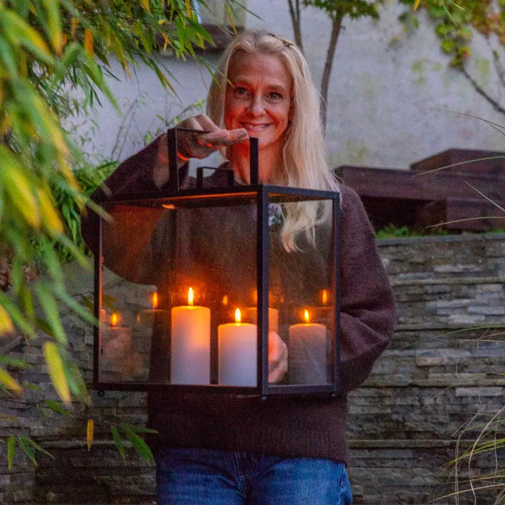 Hanne bruker gjerne LED-kubbelys i lyktene utendørs. De slår seg av og på av seg selv så hun slipper å følge med på dem.