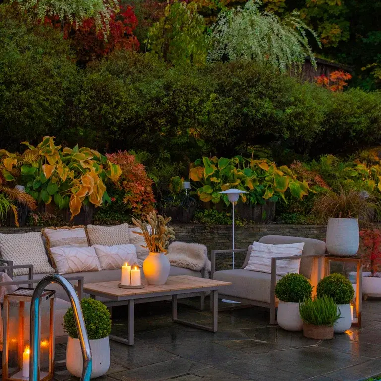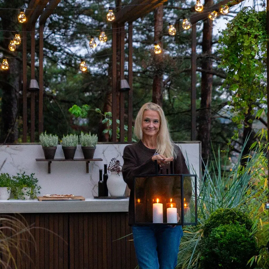 – Jeg er en forkjemper for å bruke hagen hele året. Nå om høsten elsker jeg å følge med på hvordan fargene endrer seg fra dag til dag. Belysning er noe av det som gir ekstra dekorverdi, skaper magisk stemning og bidrar til å kunne nyte utesesongen lengst mulig. Det er noe helt eget når skumringen og blåtimen inntreffer om høsten her i Norden, sier Hanne.