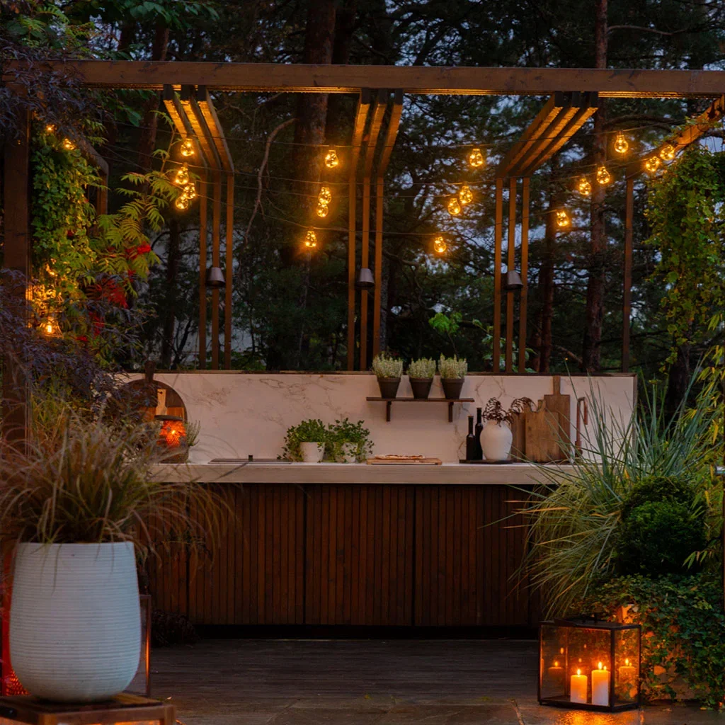 Lyslenker i pergolaen over utekjøkkenet skaper et stemningsfullt tak mens lykter i ulike høyder skaper dybde.