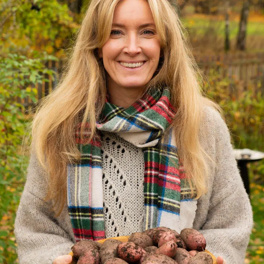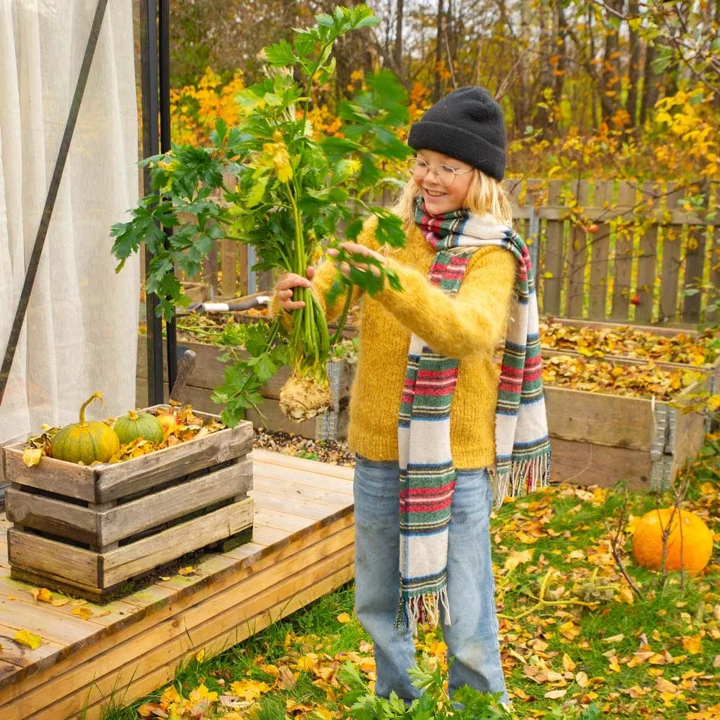 – Det er spesielt gøy for yngstemann, Tim, å se at det endelig har blitt noe godt av alle de små frøene han har vært med å så tidligere i sesongen, sier Tanja mens hun graver i jorda etter poteter.