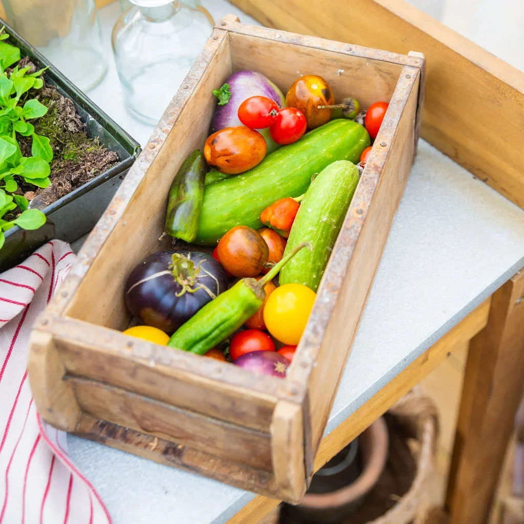 Tomat- og agurkplantene i drivhuset tømmes for frukt nå på slutten av sesongen og legges til modning i sola på kjøkkenbenken. Sellerirot, poteter og grønnkål får stå i pallekarmene utover mot vinteren til de trengs på kjøkkenet.