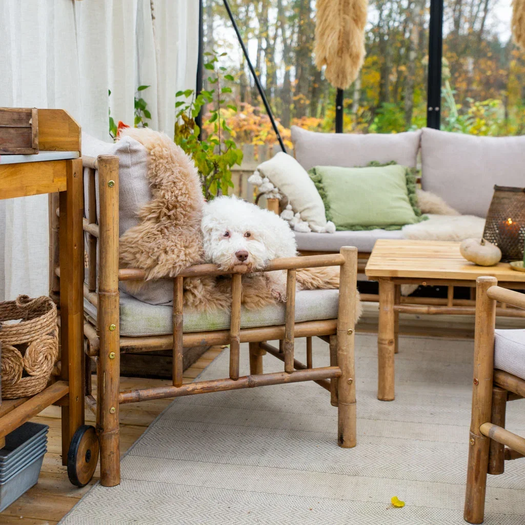 Om høsten fungerer drivhuset som en ekstra stue, bare de kler på seg litt ekstra. Hunden Kokos trives også.