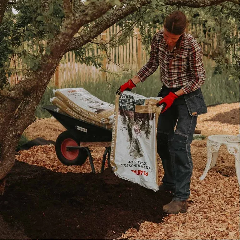 Fyll på med jord og tråkk gjennom bedet for å presse ut større luftbobler. Jeg bruker Plantasjens Plantejord Kvalitet, som man kan bestille hjem på pall. Helt perfekt når man har større prosjekter i hagen.