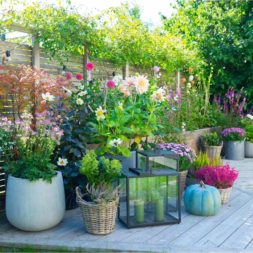 Blomstene i bed, kasser og i krukkehagen på terrassen holdes fortsatt i sin klassiske fargepalett som tidligere i sesongen – rosa, hvitt og lilla. Men med høstsolen har også oransje georginer og gule solsikker åpnet seg, noe som bidrar med ekstra varme og dybde.