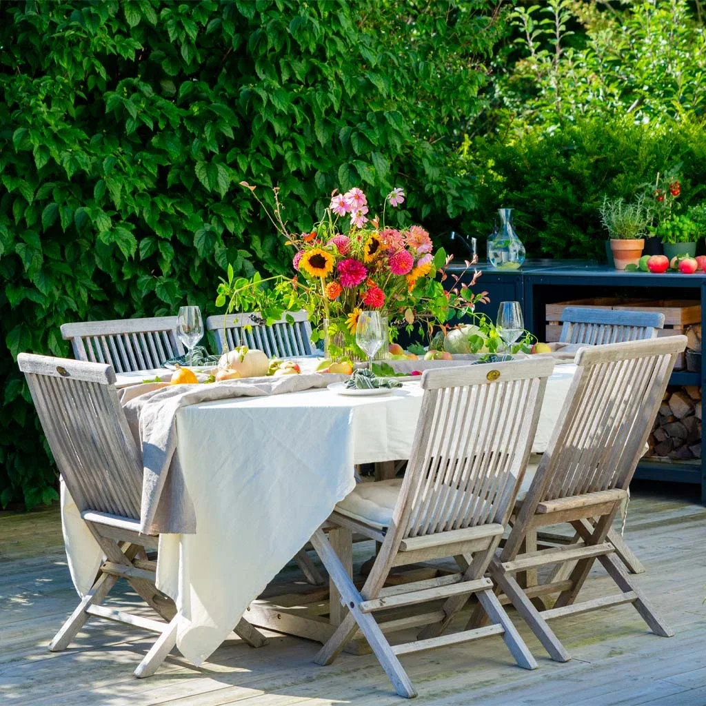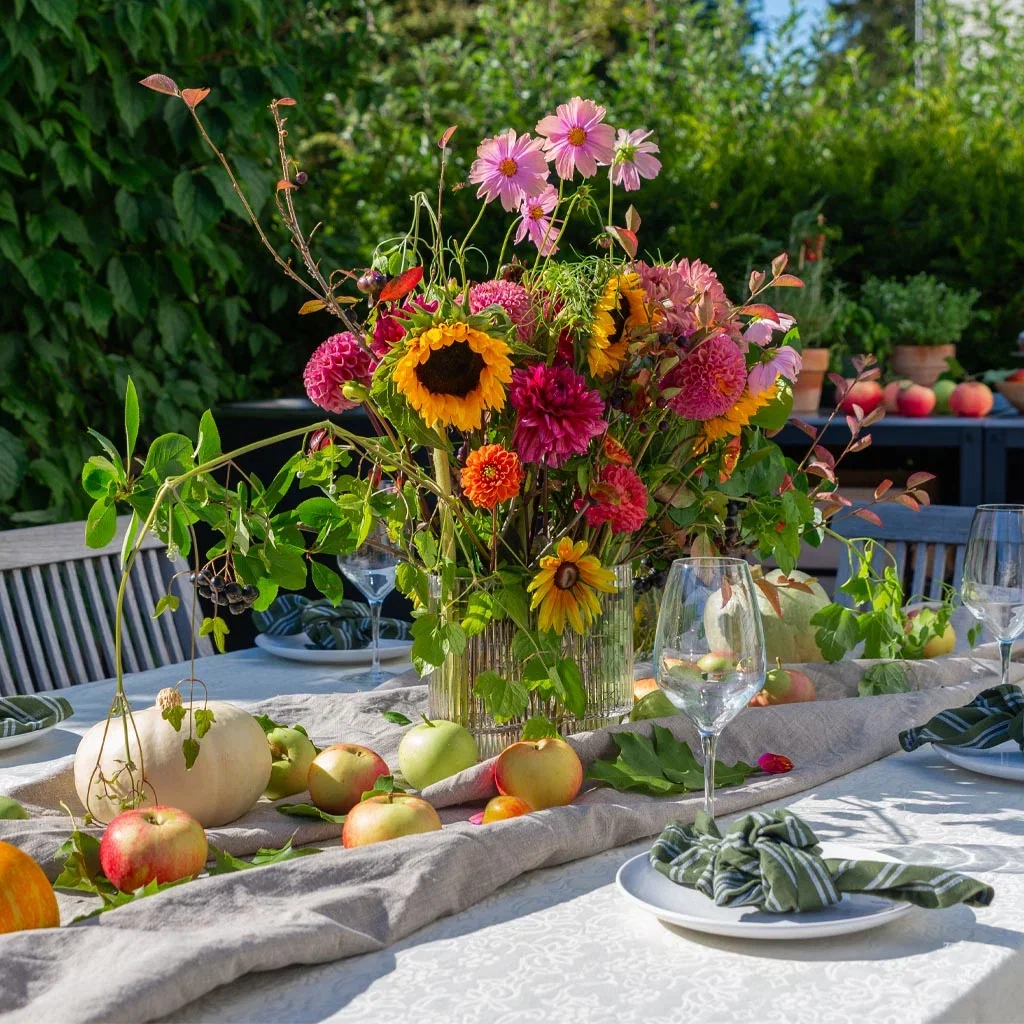 Spisesonen ved utekjøkkenet er dekket til høstfest. En høy og raus oppsats fra hagen er bordets midtpunkt. Rundt omkring på duken ligger epler og små gresskar.
