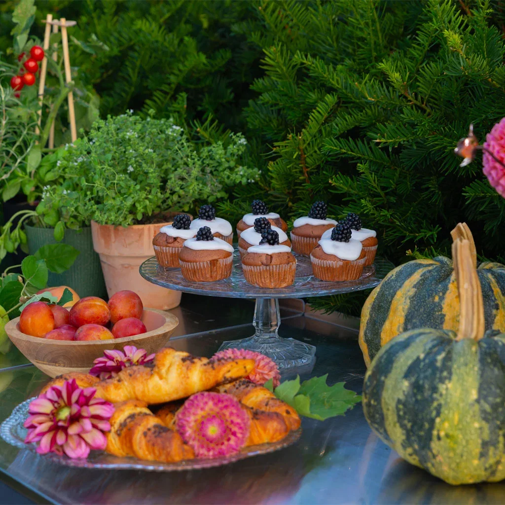 Vakre blomster er strødd rundt på toppen av kakefatene og setter prikken over i-en. Muffinsene er bakt av barna og pyntet med bjørnebær de har plukket selv en meter unna bordet. Nå er det nemlig plukketid i hagen. En klatreglad plante med lange grener fulle av modne bjørnebær breier seg utover ved inngangen til terrassen og frister til å ta en pause og smake hver gang familien går inn og ut.