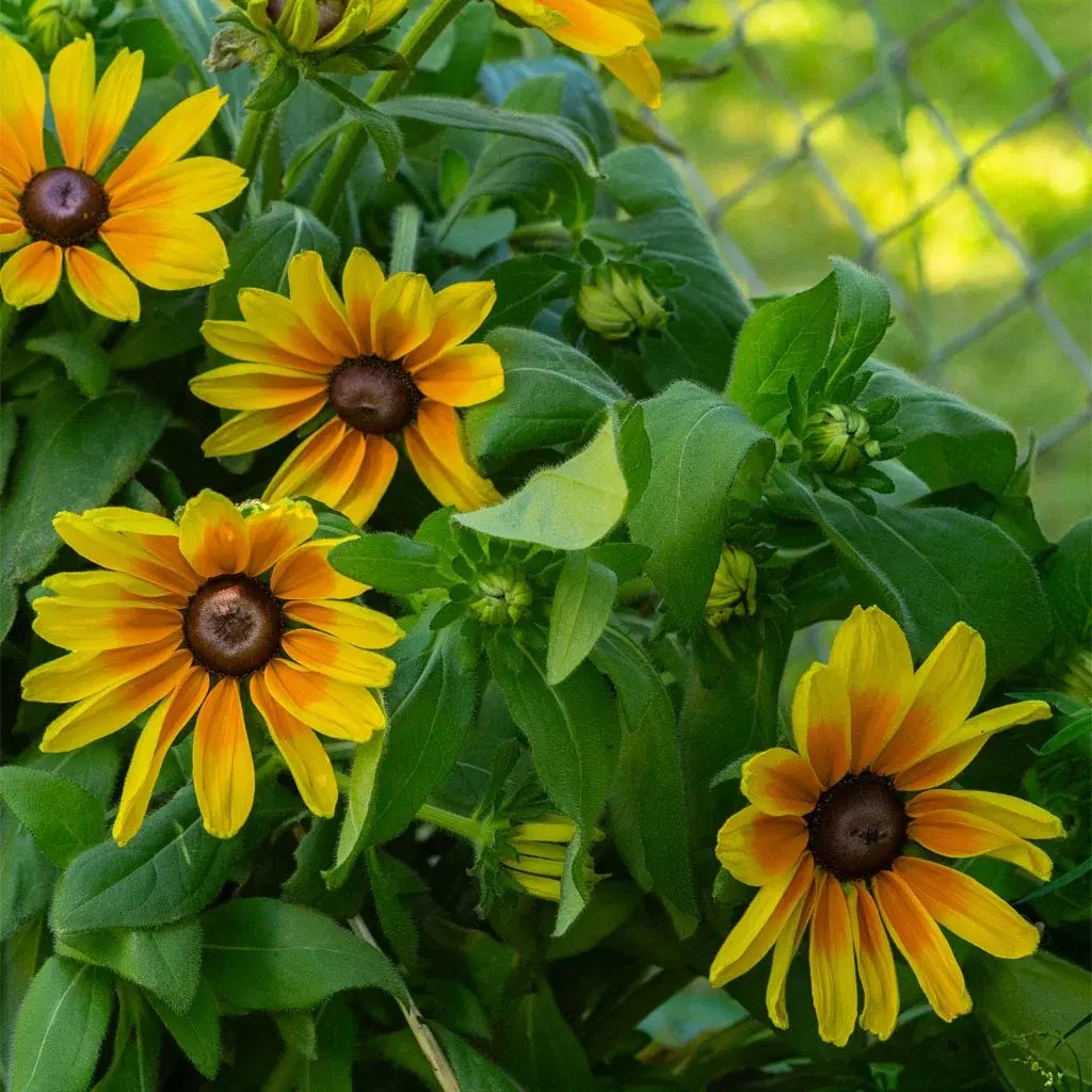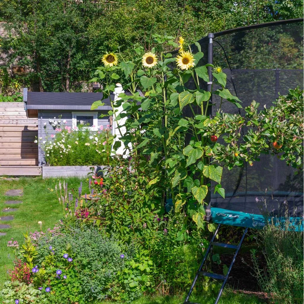 Busker, trær og stauder som kommer igjen år etter år har skiftet farge til mer rødlige toner. De høye solsikkene strekker seg mot sola og fungerer som kamuflasjevegg for hagens trampoline, en idé Therese har kommet på selv og testet ut gjennom flere sesonger. `Moonwalker´ er solsikkesorten hun sverger til fordi den er buskete i veksten, får flere blomster på hver stamme og dekker dermed godt i bredden.