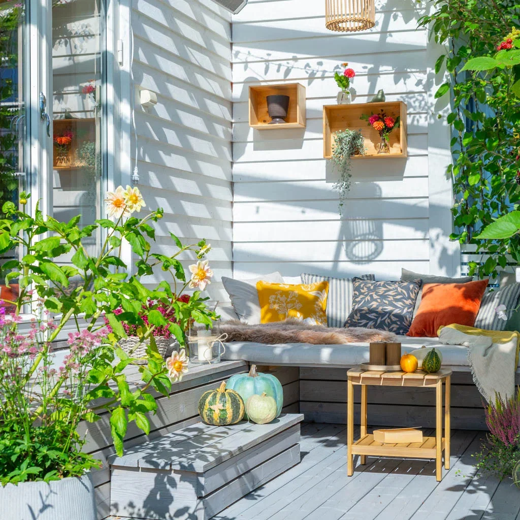 Tidlig på høsten er daybeden på terrassen flittig i bruk. Familien elsker å slappe av her ute etter jobb og skole. Siden den har overbygd tak og varmelampe kan utelivet nytes her langt utover i sesongen.