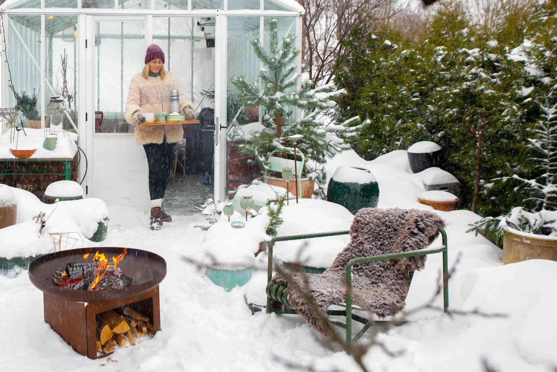 Det knitrer i bålpannen mens snøen daler ned. På det som om sommeren er en italiensk piazza full av bugnende krukker foran drivhuset, har Anniken nå måkt plass til en bålpanne. Her kan familien nyte varmen fra flammene under den stemningsfulle lysslyngen mens hagen har den hvite vinterkjolen på.