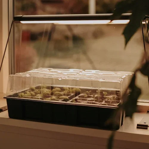 Dersom et frø har fått våkne til liv av fukten i jorden, men siden tørker ut så vil frøet dø. Derfor bruker jeg alltid minidrivhus til forkultivering. Da har jeg et brett å vanne i, mens pottene og drivhusdelen holder fuktigheten inne og slipper lyset til. Det er helt perfekt for frøene, som får jevn fuktighet og unngår å tørke ut. Jeg bruker minidrivhuset fra Plantasjen sammen med disse frøbrettene. De kan jeg bruke igjen år etter år, og de bidrar også til å holde jorden jevnt fuktig.