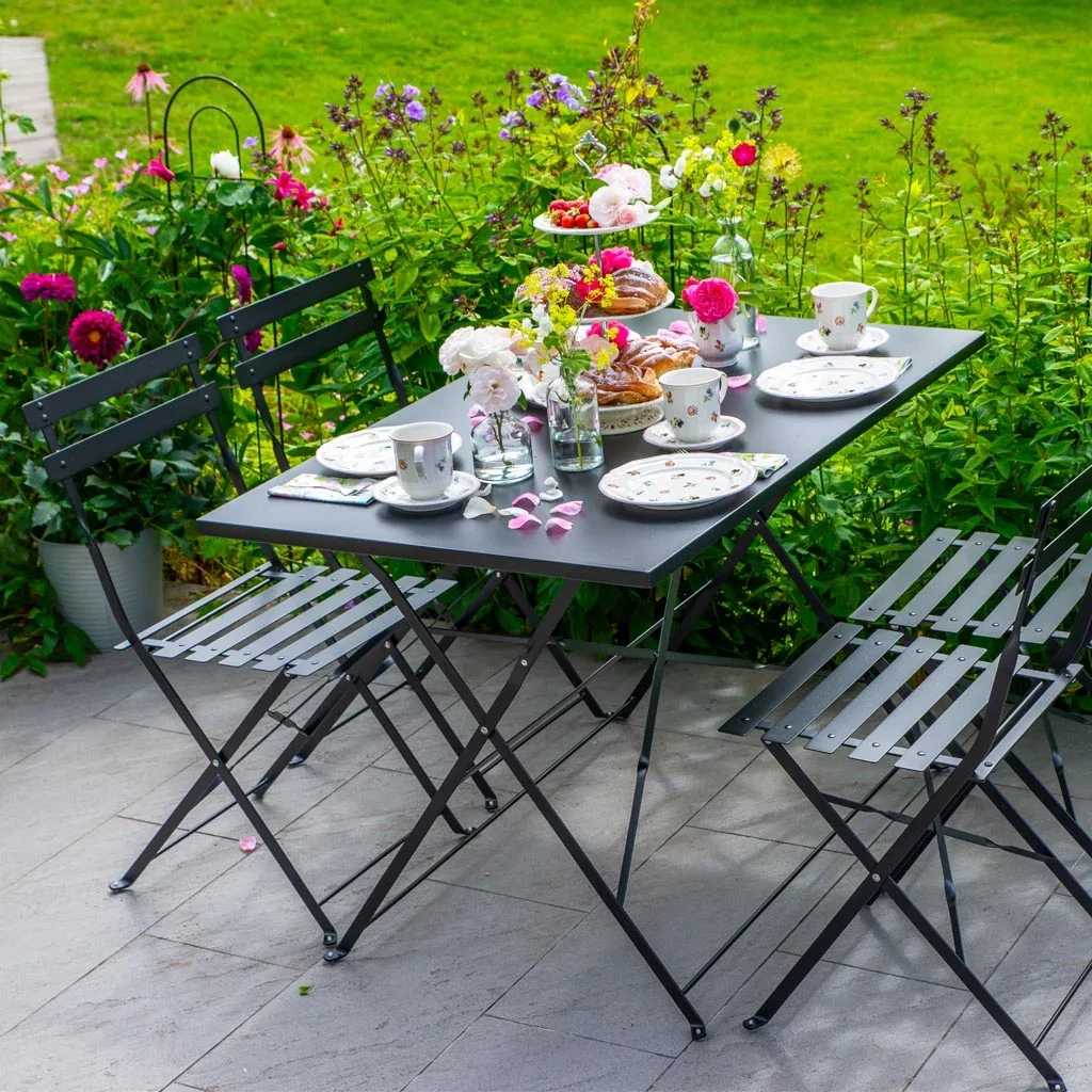 Osaka spisegruppe i pulverlakkert stål er sammenleggbar og et perfekt valg for fleksible uteplasser. Enkelt å pakke bort og lett å vedlikeholde.