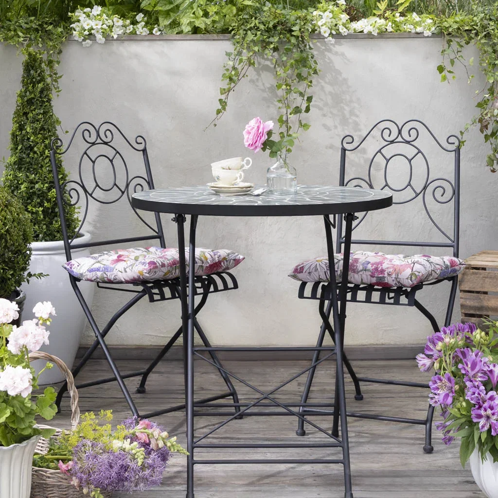 Marokko kafésett i pulverlakkert, robust jern med fliser av mosaikk på bordplaten.