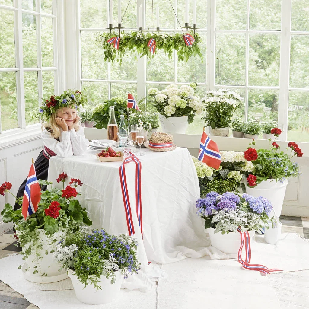 Blomster i norske farger skaper en vakker ramme for nasjonaldagen. Her er noen korte tips: