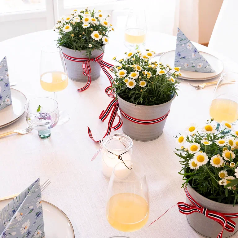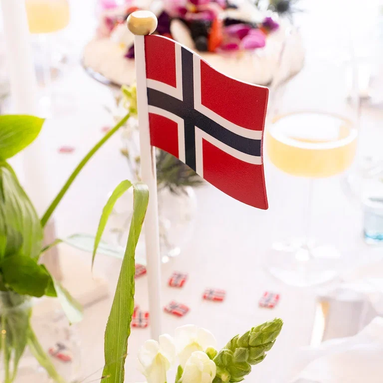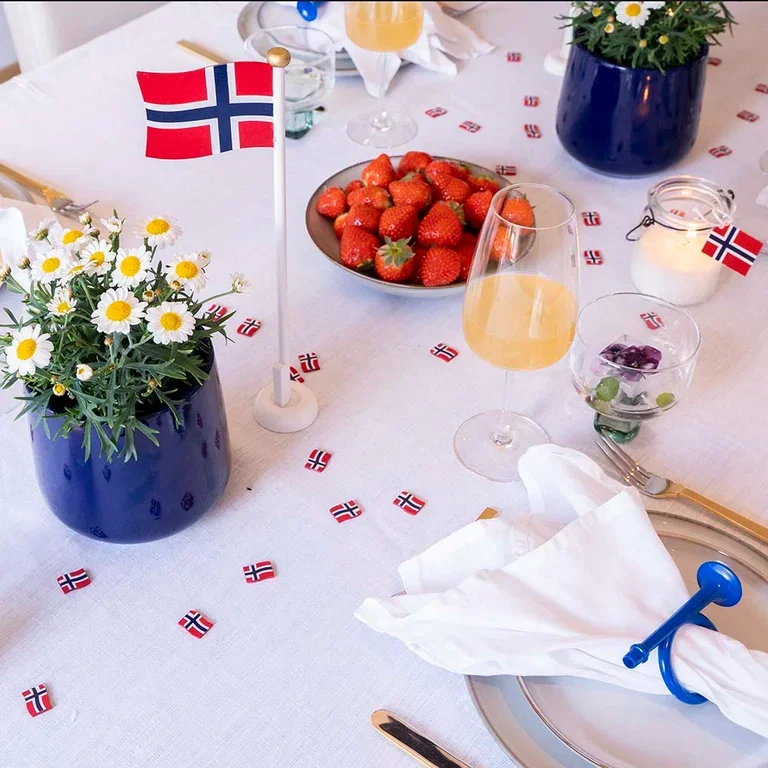 Dekorbånd, konfetti, bordflagg og blomsterpinner – så lenge det har flaggets farger, passer det godt inn på bordet. Hva med å dekke et eget barnebord? Posthorn som serviettring, sugerør i rødt, hvitt og blått eller en vindmølle som ligger klar på tallerkenen, vil garantert spre glede og latter.
