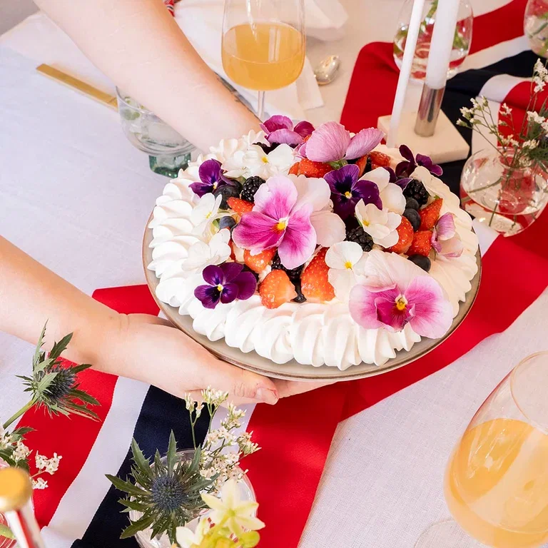 Ingen nasjonaldag uten Pavlova, mener mange. Topp den med mengder av bær og noen spiselige blomster.