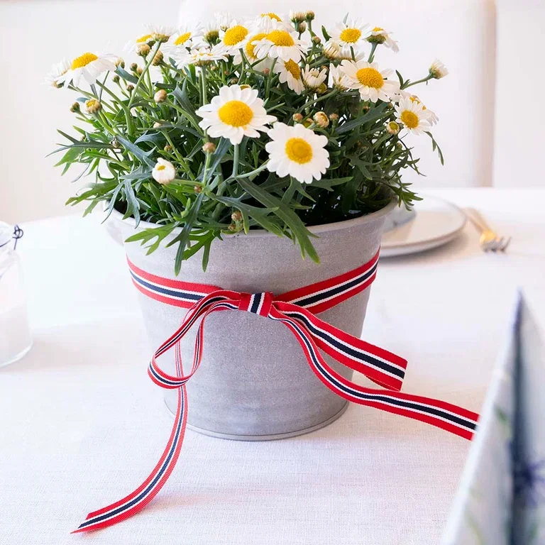 Et enkelt, stilrent og klassisk 17. mai-bord med margeritter og flaggdekorbånd.