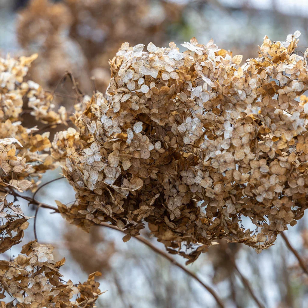 La gjerne blomstene sitte igjen over vinteren, de er ofte dekorative med frost på. Rist bort snøen fra greiene, slik at de ikke knekker. Når våren banker på døren, kan du klippe ned blomstene fra i fjor og glede deg til nye blomster på sensommeren. Annen beskjæring er ikke nødvendig, men syrinhortensiaen blomstrer på årets skudd og tåler beskjæring om du skulle ønske det. Du kan for eksempel beskjære grener som er lenger enn andre eller tynne ut ved å fjerne eldre grener. Dette bør i så fall gjøres i overgangen mellom vinter og vår.