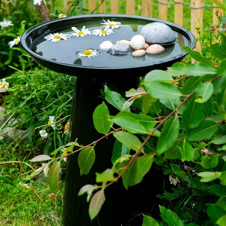 I vannbadet kan fugler og andre med vinger ta seg en slurk vann og et avkjølende bad på varme dager. Steinene gir dem noe å lande på.