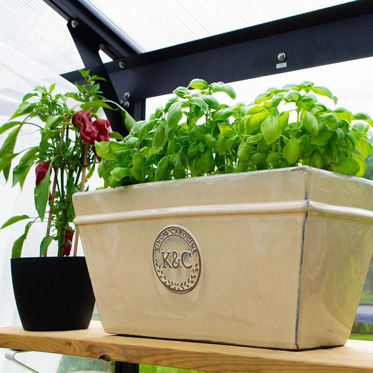 Smarte hylleknekter gjør at det enkelt kan henges opp hyller i vinduene i drivhuset. Snackpaprika, basilikum og mynte elsker sol, lys og varme.